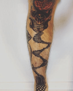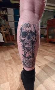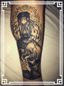 „Den Stil des Tattoos habe ich extra in Anlehnung an alte Kupferstiche gewählt, um die Tradition unserer alten Bruderschaft auszudrücken. Ein Buch, welches hier nicht als Symbol des heiligen Gesetzes ist, sondern „Wissen“ repräsentiert. Darüber der Totenkopf, unsere sterbliche Hülle, durch die Wissen fließt, im Hintergrund ein Wirbel, da sich alles in Zyklen bewegt. Das Uhrglas, unsere Zeit ist begrenzt in der wir Wissen erfahren können. Das Winkelmaß und den Zirkel über allem, da wir an alle unsere Handlungen diese Werkzeuge anlegen (sollten).“